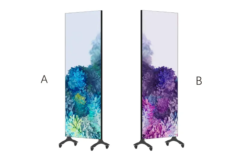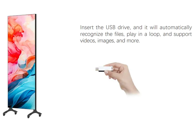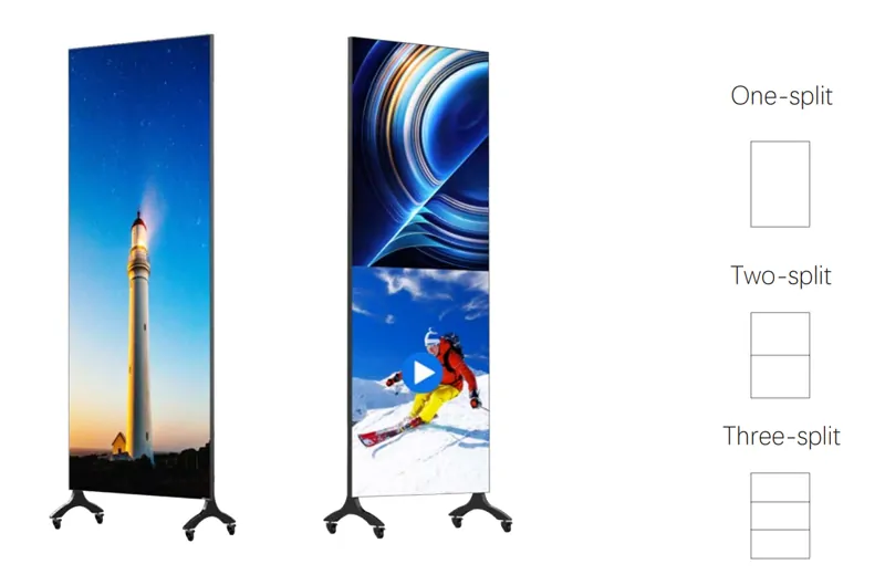 Feature-rich digital poster. Dual-sided display, mobile, and remotely controlled via Wi-Fi. A favorite for malls and chain stores.